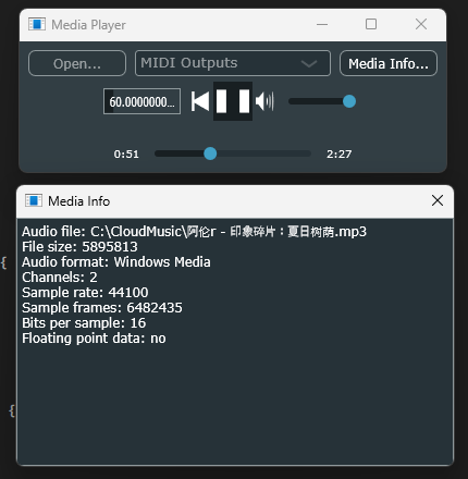 Here I introduce file I/O and real-time audio playback using JUCE’s transport classes. Audio formats are registered with juce::AudioFormatManager::registerBasicFormats(), a file is chosen with juce::FileChooser, and a juce::AudioFormatReaderSource feeds samples into juce::AudioTransportSource. Playback is controlled with start() and stop(), and an on-screen position slider reflects the current playhead. A small time updater runs in juce::Timer::timerCallback() to keep labels and sliders synchronized without burdening the audio thread. Actual audio samples are pulled in getNextAudioBlock(const juce::AudioSourceChannelInfo&), where I also apply gain to demonstrate a simple signal path. The key division of labor is crucial: transport and UI live on the message thread, while audio stays in getNextAudioBlock, lock-free and fast.