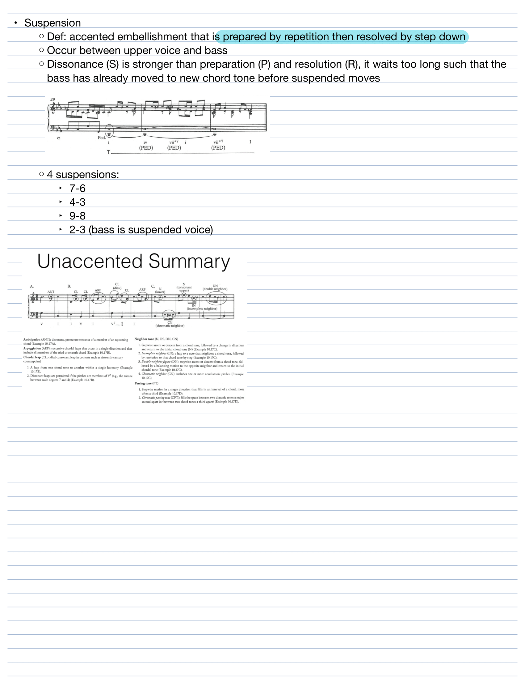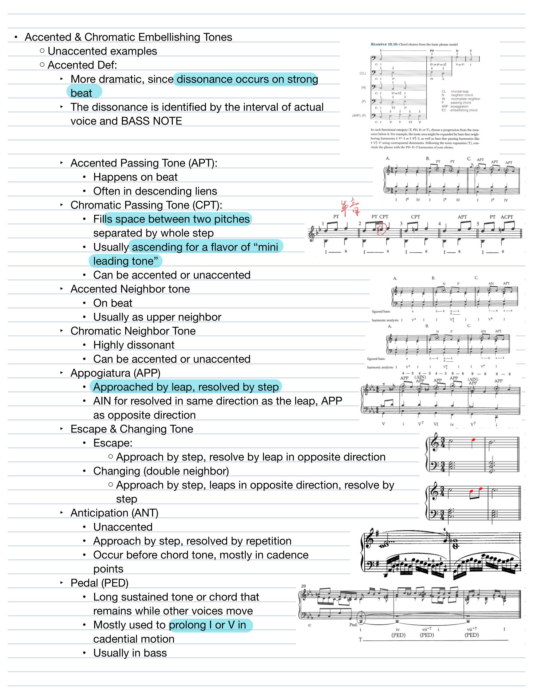 - PT/NT (diatonic & chromatic), APT, CPT, ANT, APP (AIN vs APP directionality), escape tones, changing tones (double neighbors), and pedal points for I or V prolongation.