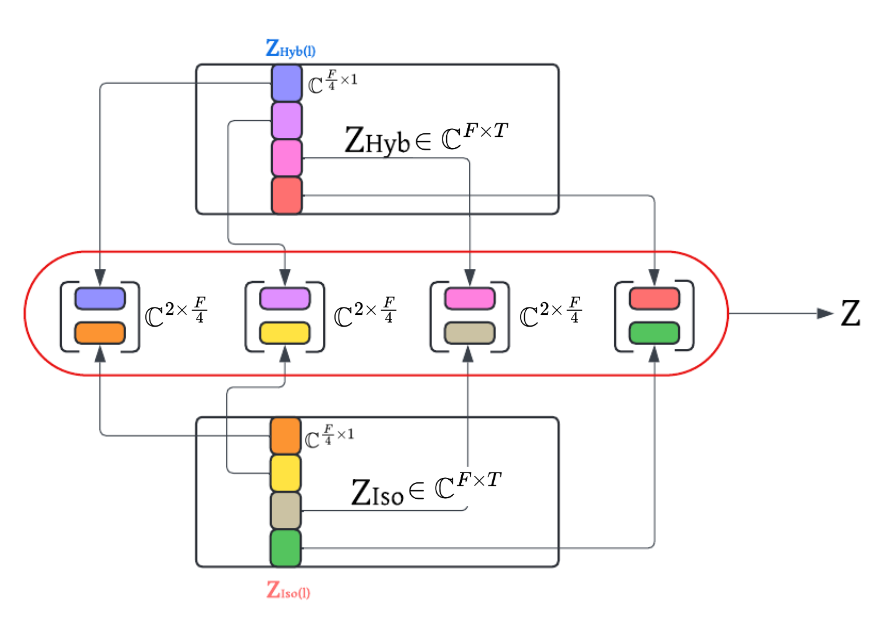 - Sub-band Inter-Method PCA. Replace wide-band PCA with per-band PCA over $K$ equal-width frequency groups: $ Z=[Z_1,\dots,Z_K],\; Z_i\in\mathbb{C}^{2\times F/K} $. This respects frequency-dependent beam patterns and SNR, improving high-band preservation.