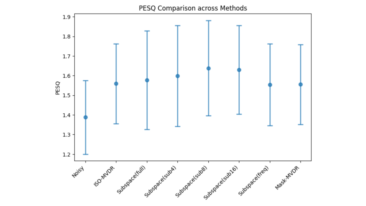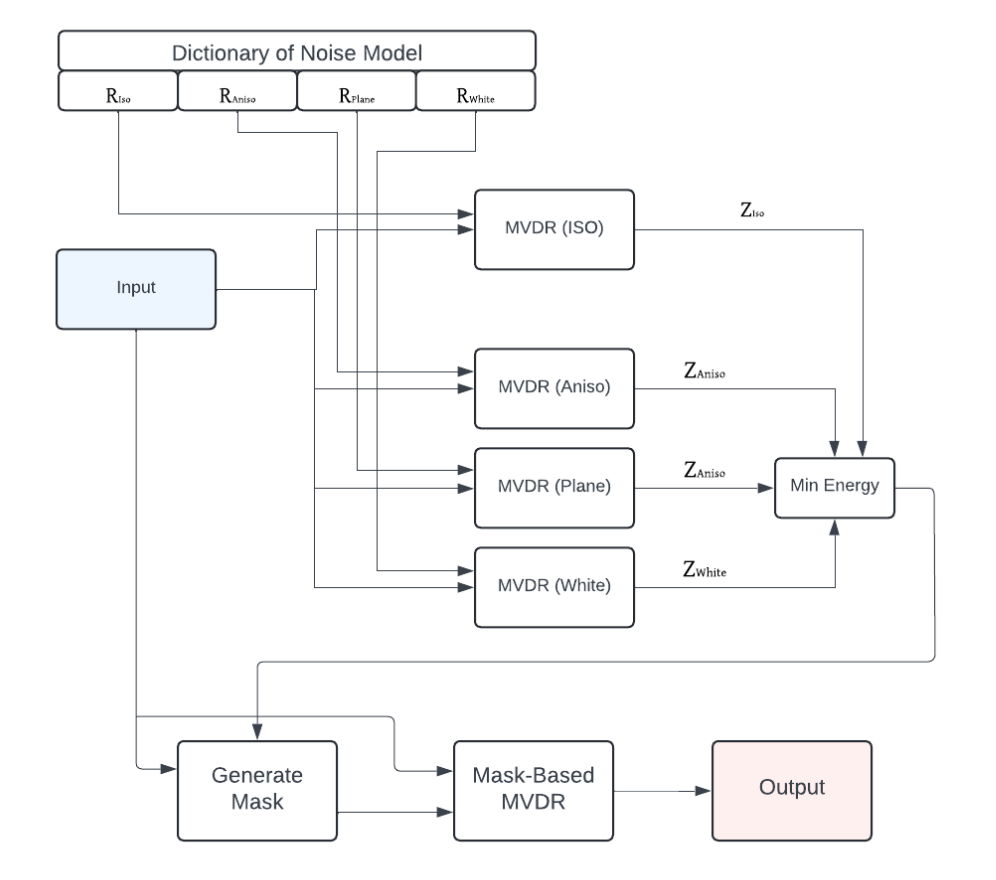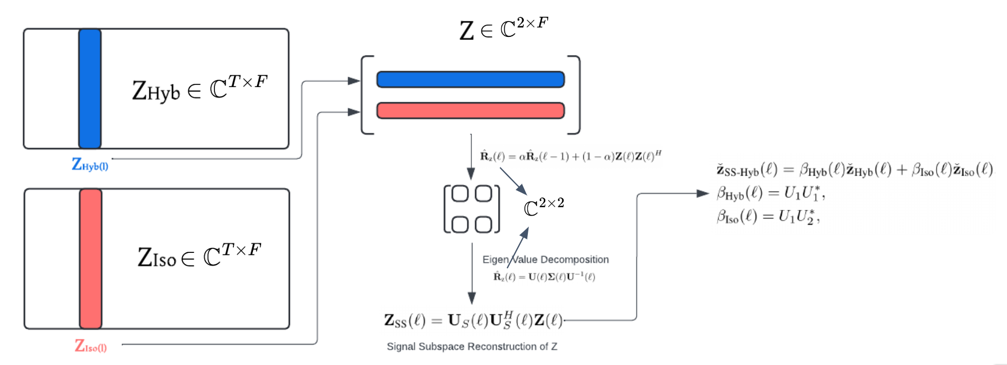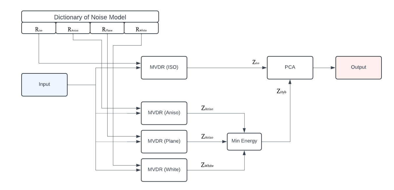 \[\mathbf{w}(f)=\frac{\mathbf{R}^{-1}(f)\mathbf{d}(\theta)}{\mathbf{d}^H(\theta)\mathbf{R}^{-1}(f)\mathbf{d}(\theta)}.\]Hybrid-MVDR builds a small dictionary of $ \mathbf{R} $ (isotropic, anisotropic diffuse, plane-wave, white), applies each MVDR per TF bin, and selects the minimum-energy output; this denoises aggressively but induces musical noise from rapid switching. Subspace Hybrid-MVDR then applies Inter-Method PCA to (iso, hybrid) outputs to smooth artifacts.