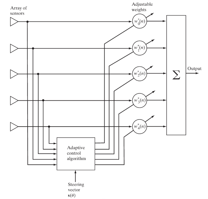 MVDR minimizes output power with a distortionless constraint $\mathbf{w}^H\mathbf{d}(\theta)=1 $ using a noise covariance $ \mathbf{R} $: